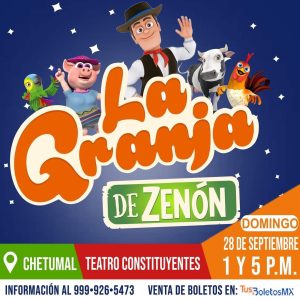 Este domingo 28 de septiembre, las familias chetumaleñas podrán disfrutar de la obra infantil La Granja de Zenón en el Teatro Constituyentes, con funciones a la 1:00 y 5:00 de la tarde. Este espectáculo está pensado para los más pequeños y promete una experiencia llena de música, diversión y personajes entrañables.