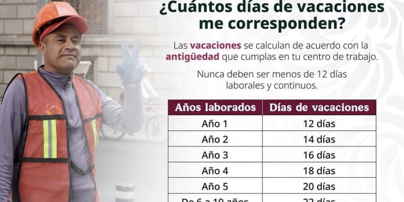 La legislación señala que, a partir del primer año de servicios, las y los trabajadores cuentan con 12 días de vacaciones, los cuales aumentan en dos días por cada año adicional hasta llegar a 20. A partir del sexto año de antigüedad, el periodo vacacional se incrementa en dos días por cada cinco años laborados.